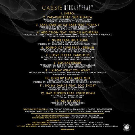 Множество клипов и синглов от Cassie это подготовка к чему-то большему, а конкретно к микстейпу "RockaByeBaby", который вы можете послушать прямо сейчас. Помимо самой прекрасной представительницы женского пола, нас ждут на релизе гости: Wiz Khalifa, Pusha T, French Montana, Rick Ross, Fabolous, Meek Mill и др.