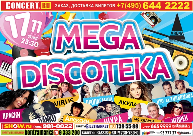 17 ноября 2012 года в 23.30, клуб АРЕНА, состоится грандиозное событие предновогодняя MEGA-DISCOTEKA. Мы ещё раз вместе с вами вспомним то беззаботное время: