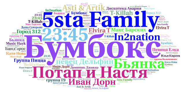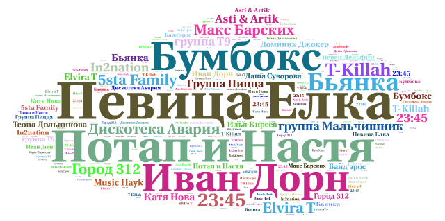 Облако тегов имен артистов по критерию количество треков ВКонтакте.