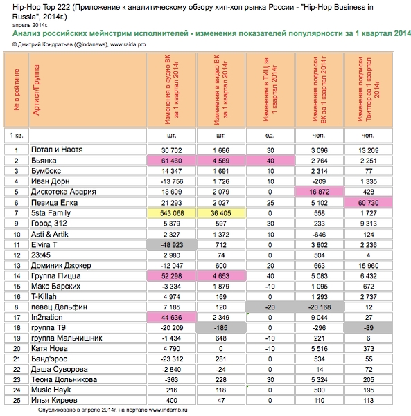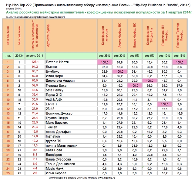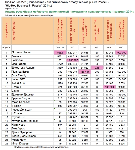Первая таблица покажет базовые показатели популярности артиста в интернет по состоянию на 1 апреля 2014г.