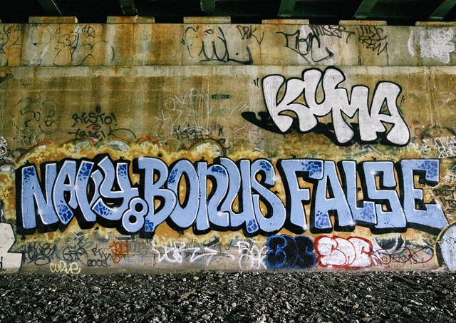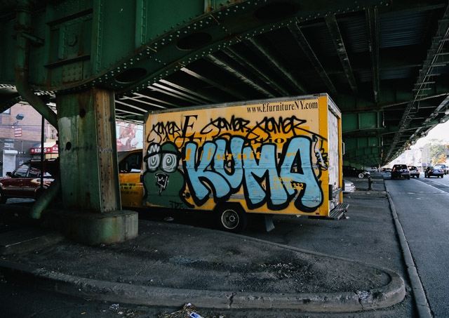 Kuma бесспорно самый известный граффити бомбер из Нью-Йорка. Вам будет очень тяжело, находясь в Нью-Йроке, не заметить хотя бы один его кусок. А его необычные формы «колбаски» угадываются издалека.