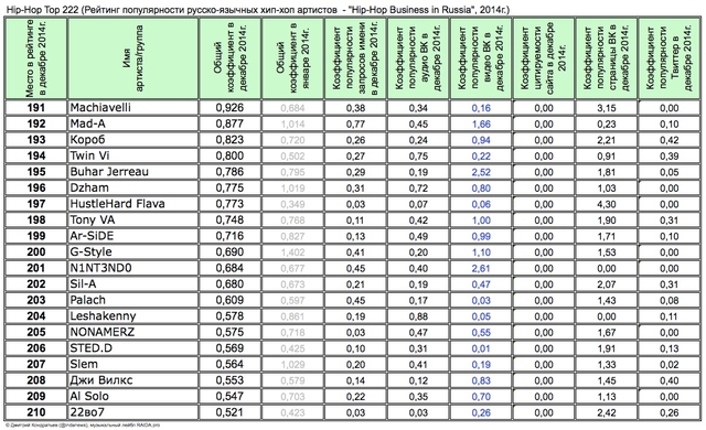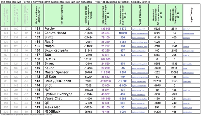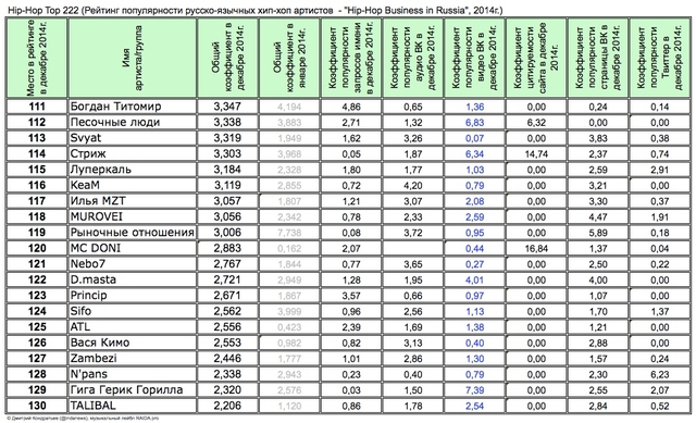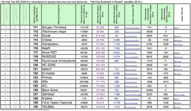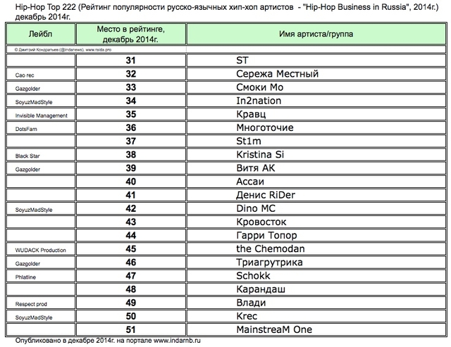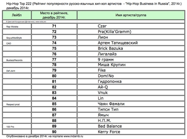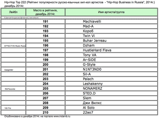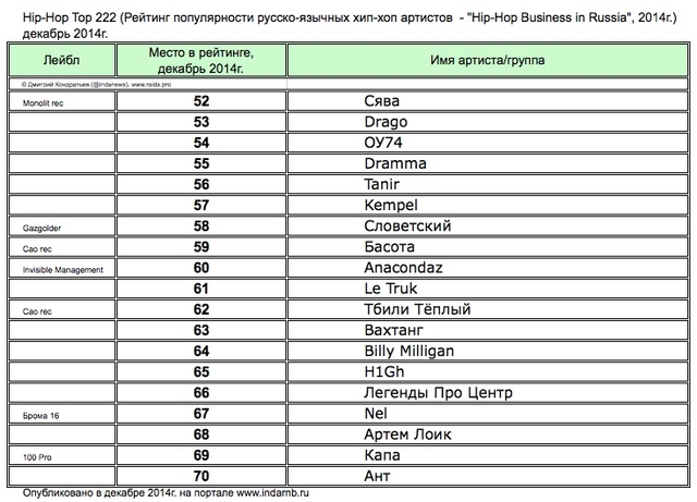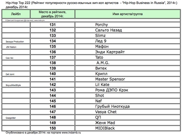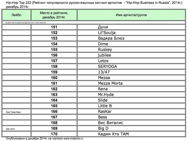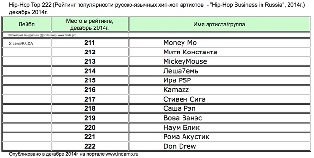 Лучшие рэперы 2014 года Hip Hop Top 222 по данным аналитиков лейбла RAIDA, в таблицах.