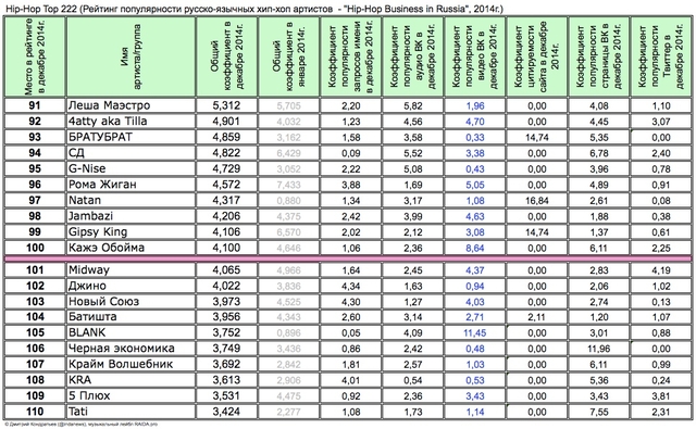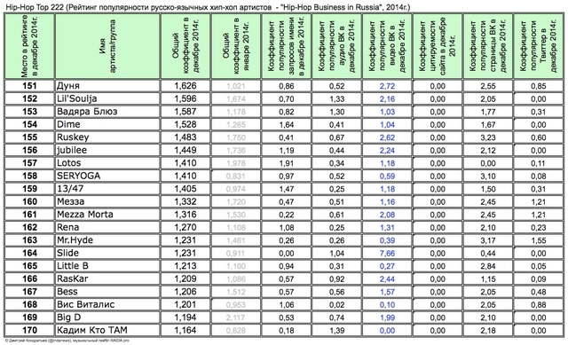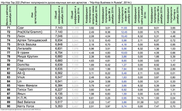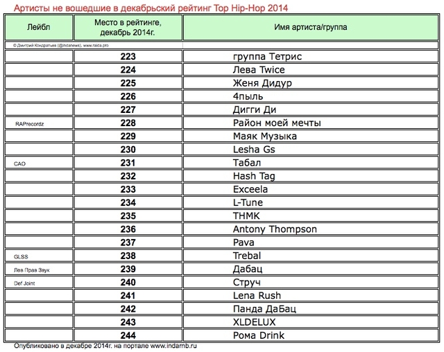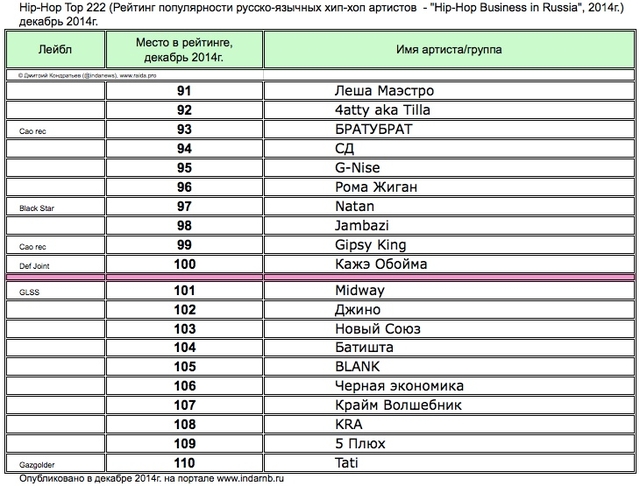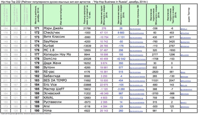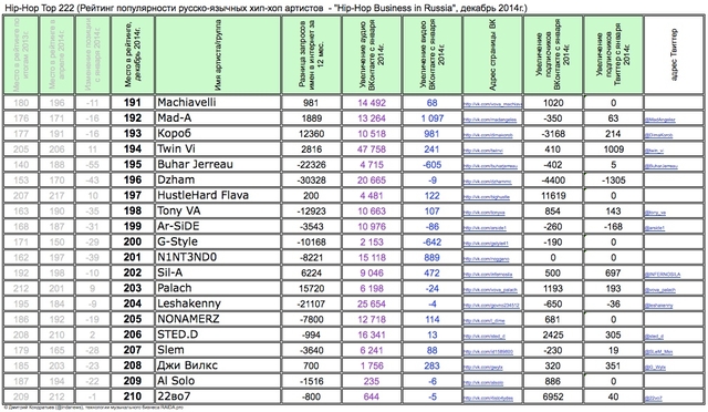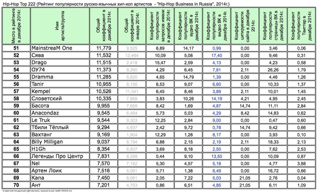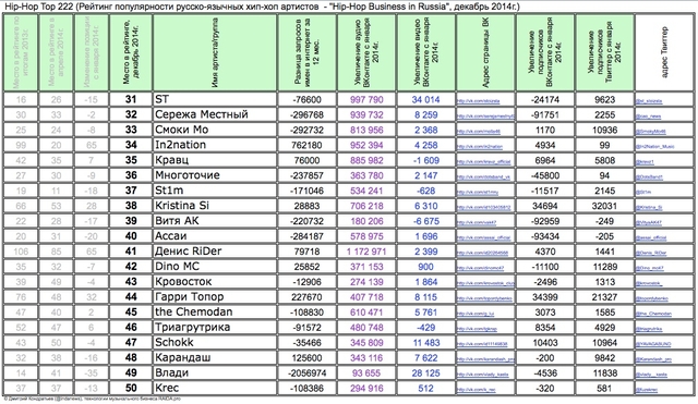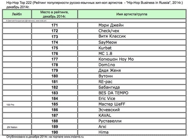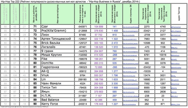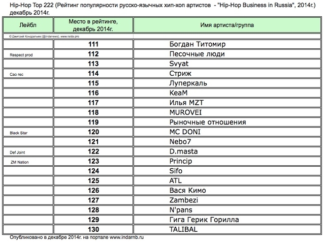 Лучшие рэперы 2014 года Hip Hop Top 222 по данным аналитиков лейбла RAIDA, в таблицах.