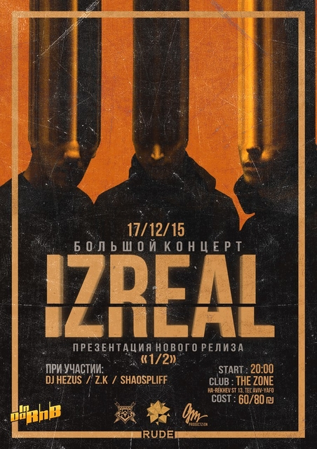 В ближайший четверг 17 декабря, в Тель-Авиве, состоится презентация нового релиза IZREAL «½». На концерте выступят также Z.K. и группа с севера Израиля ShaoSpliff.